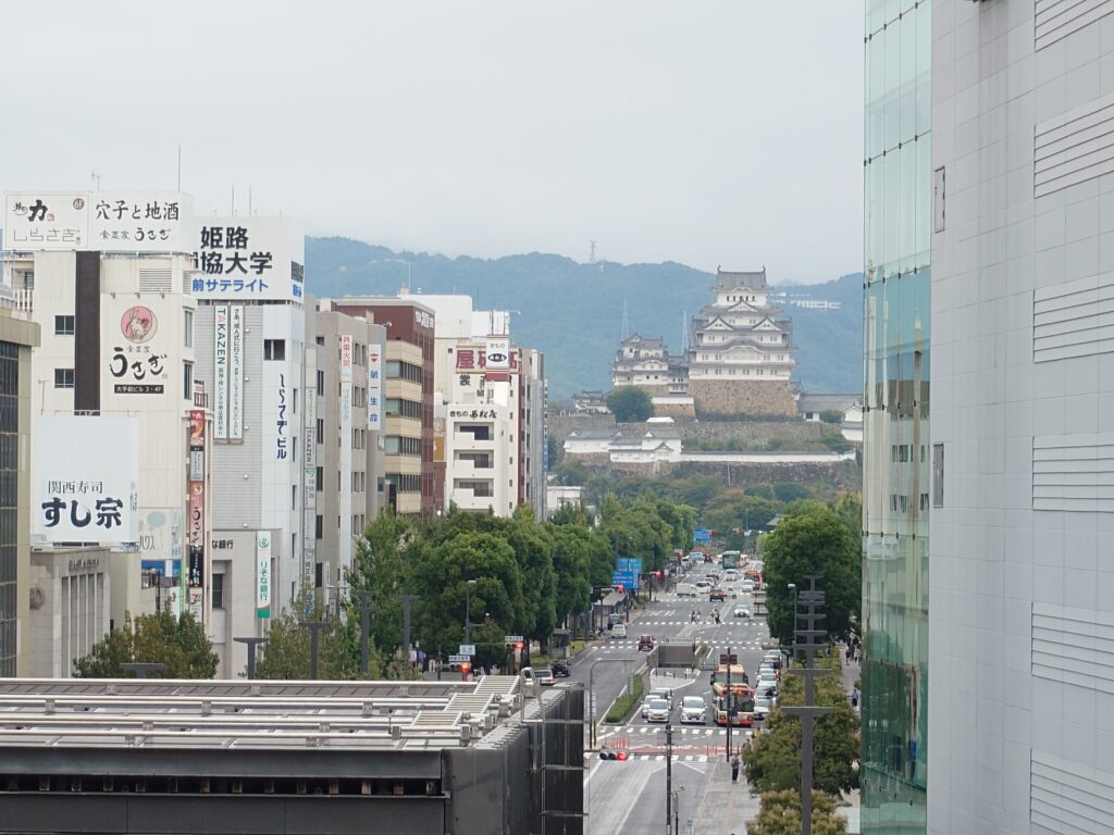 帰路、姫路駅からは姫路城が綺麗に見えました。戦災を受けずに多くの建築物が現存している「不戦・不滅の城」と呼ばれる風格が、駅からの景観にも漂っています。