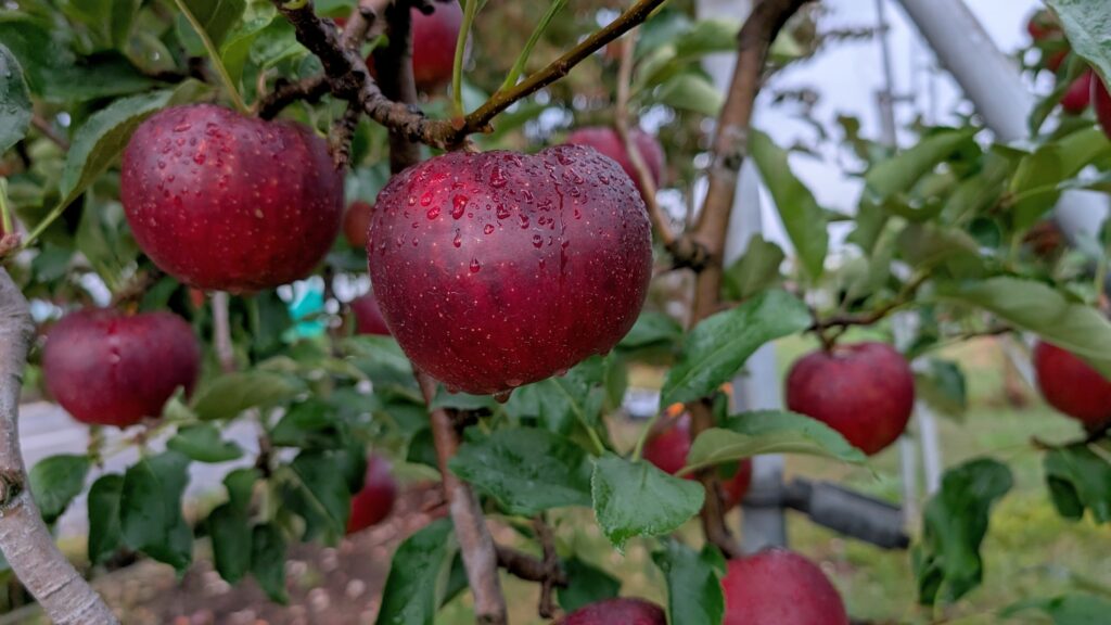少し黒み掛かったリンゴは「秋映(あきばえ)」です。